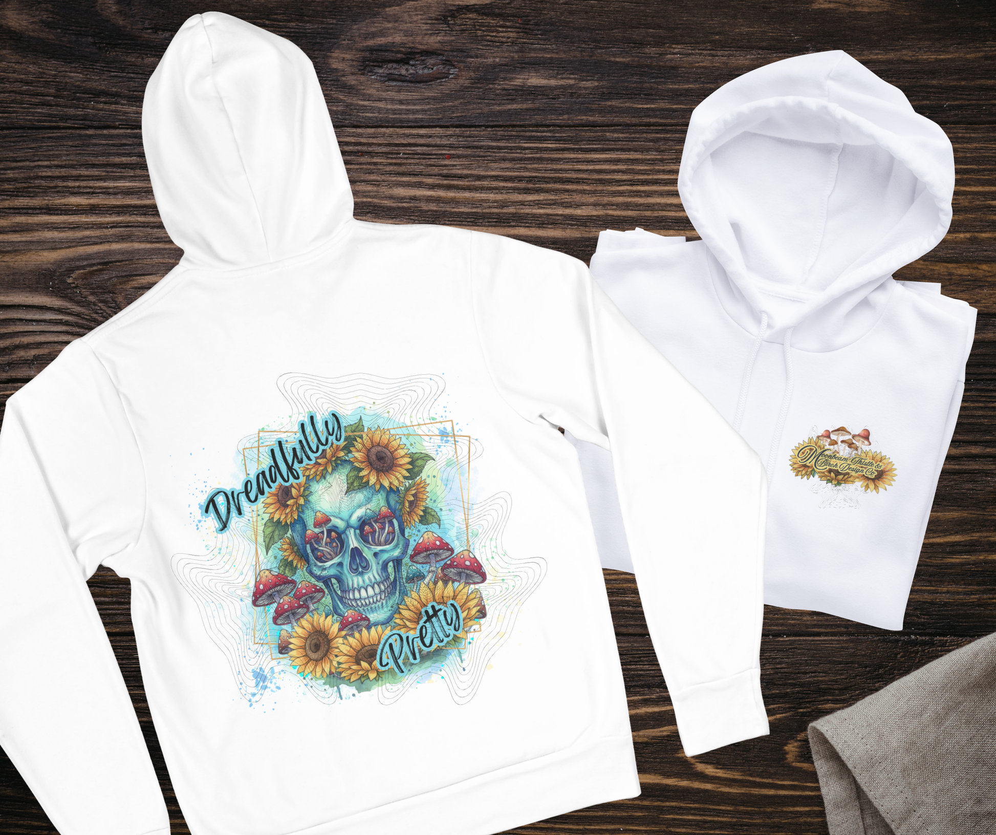 This hoodie features an exclusive MTB Design Cove design — a sunflower-crowned skull with whimsical mushrooms — printed in-house using sublimation for a long-lasting, gently weathered look.