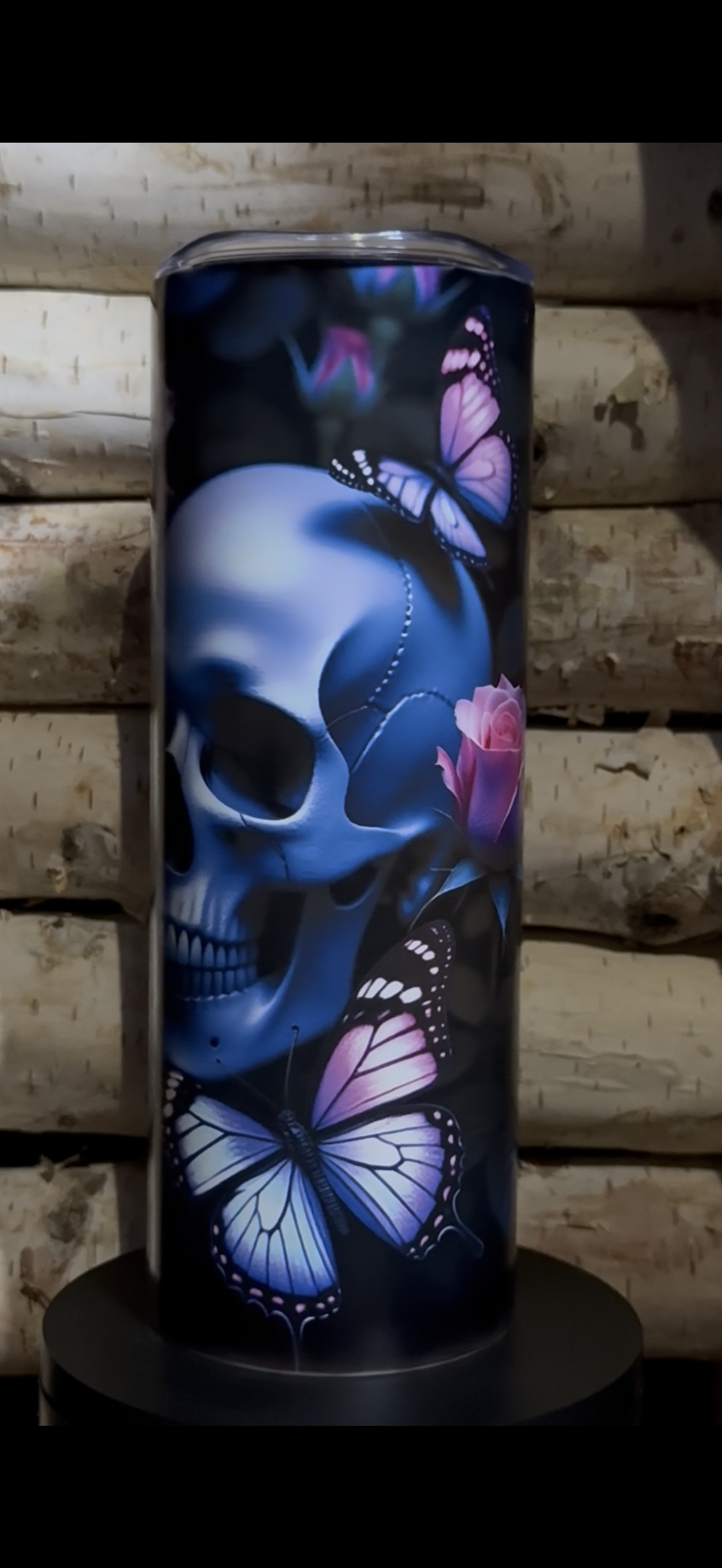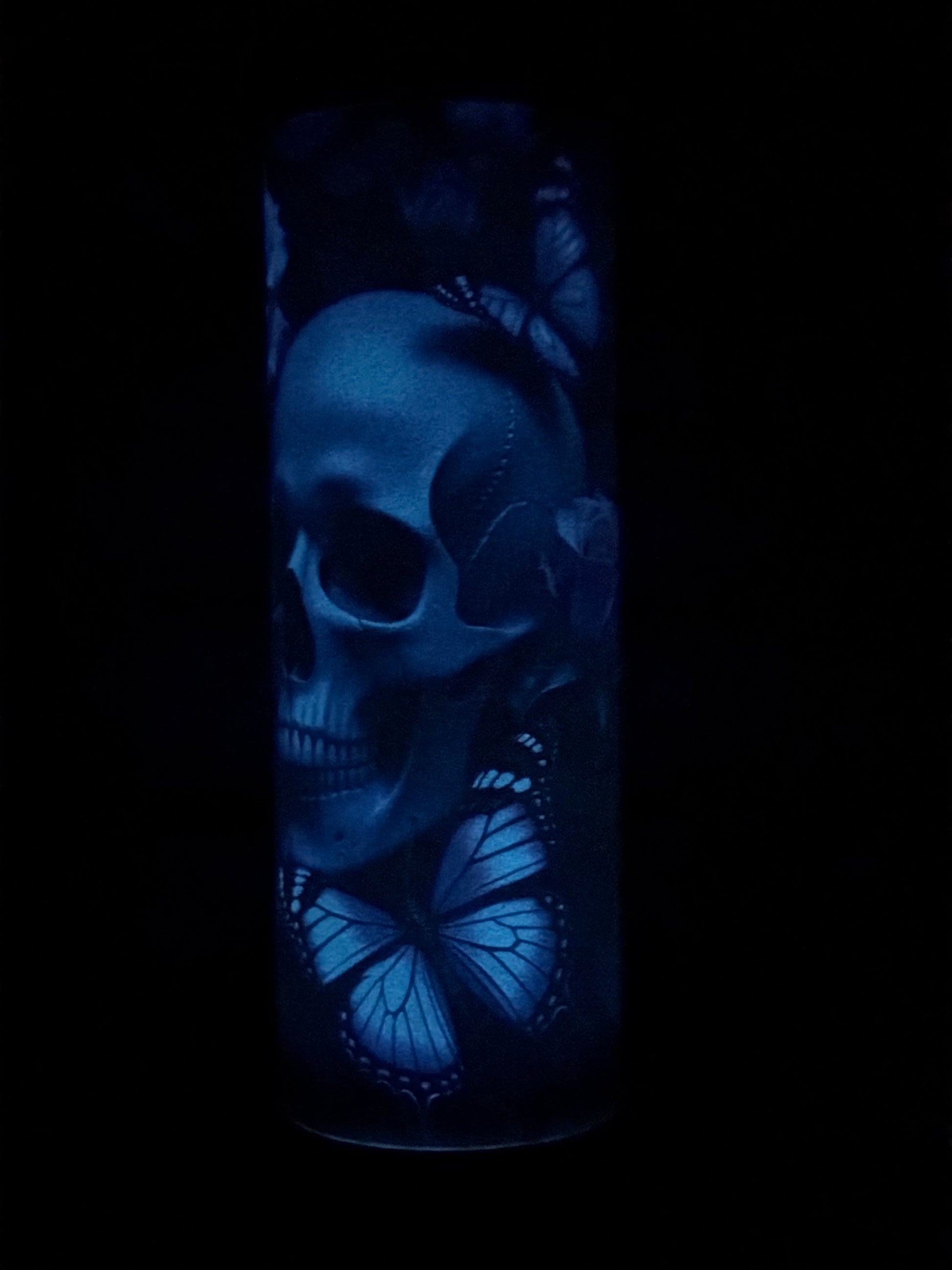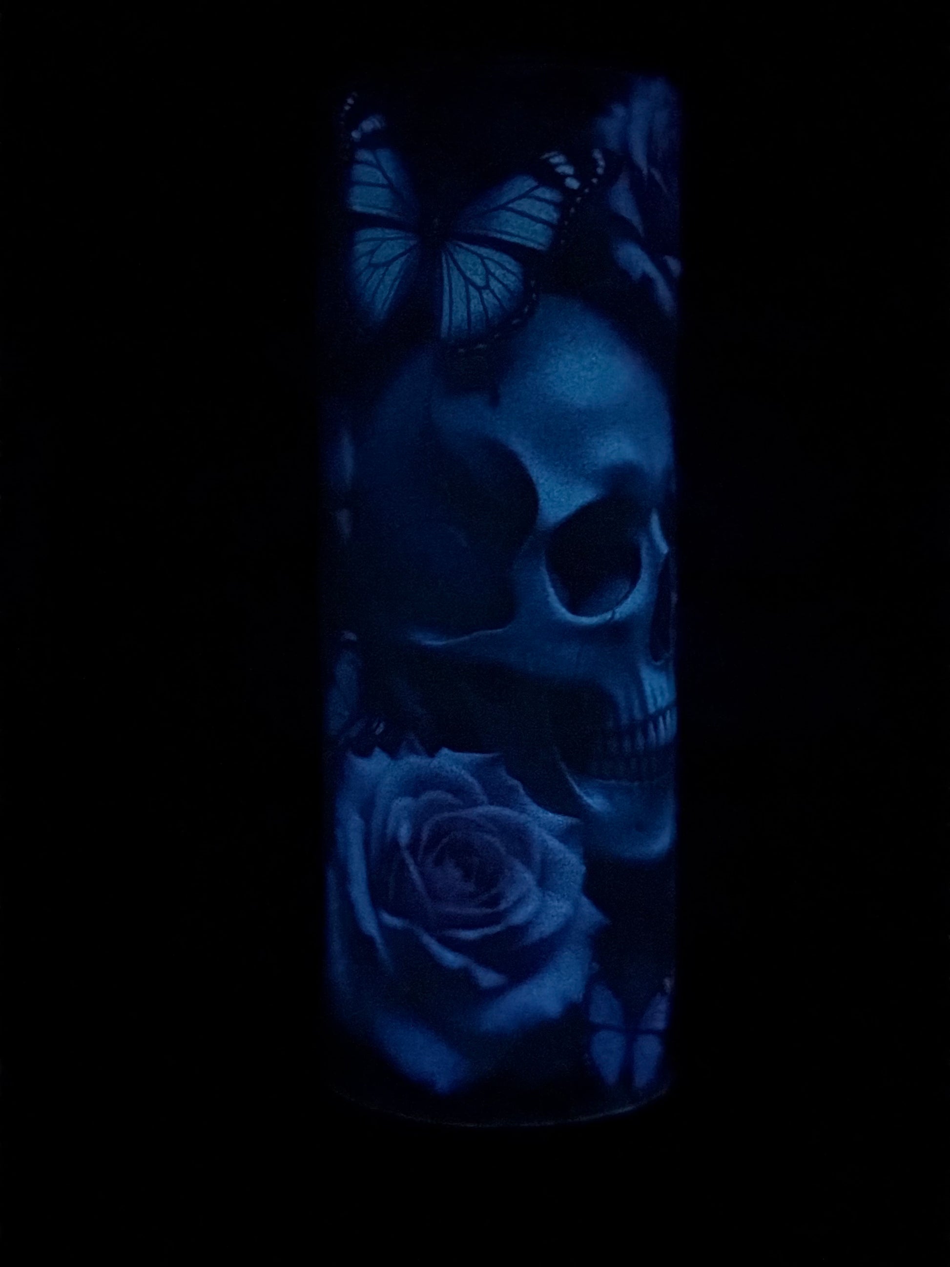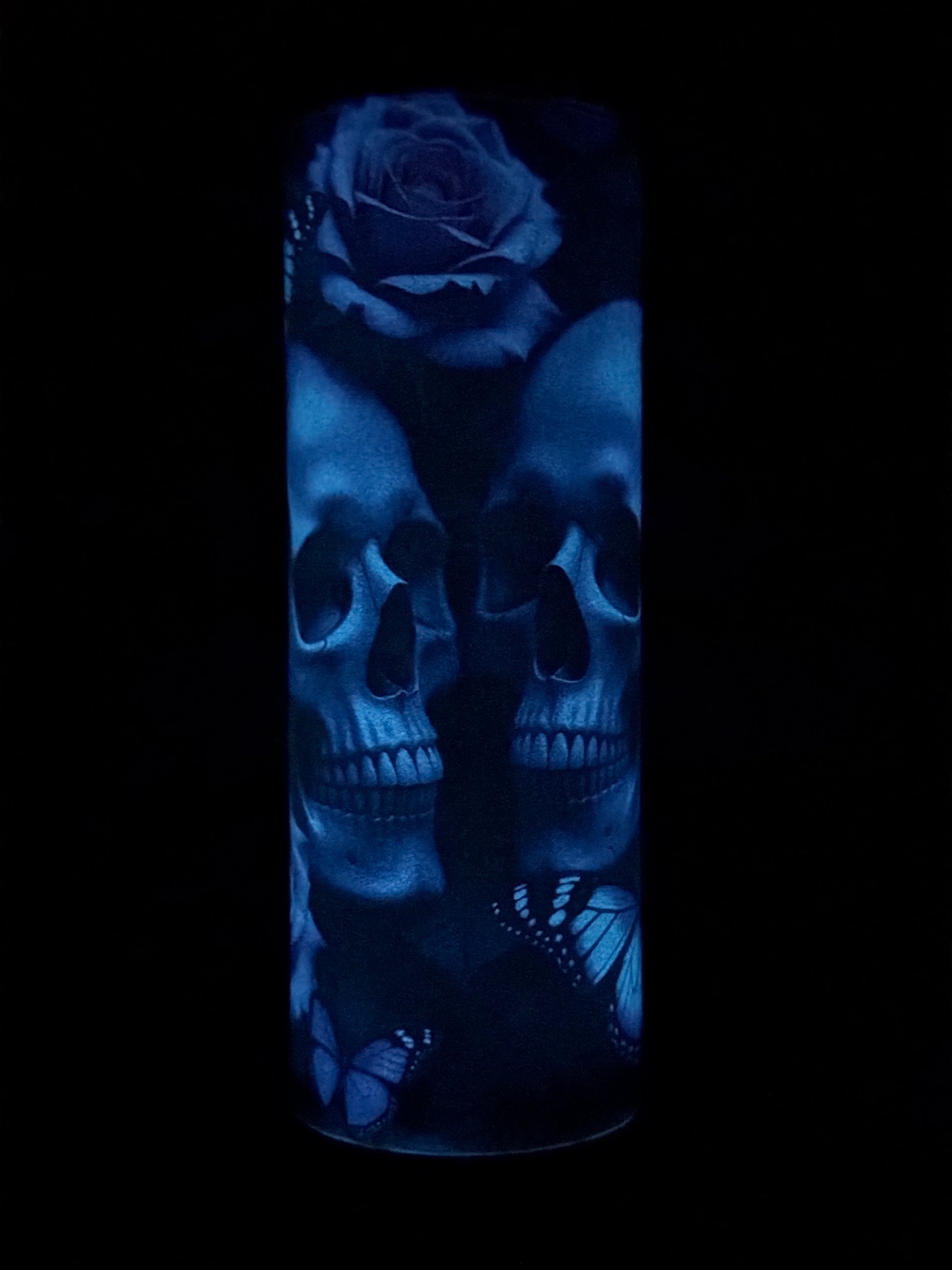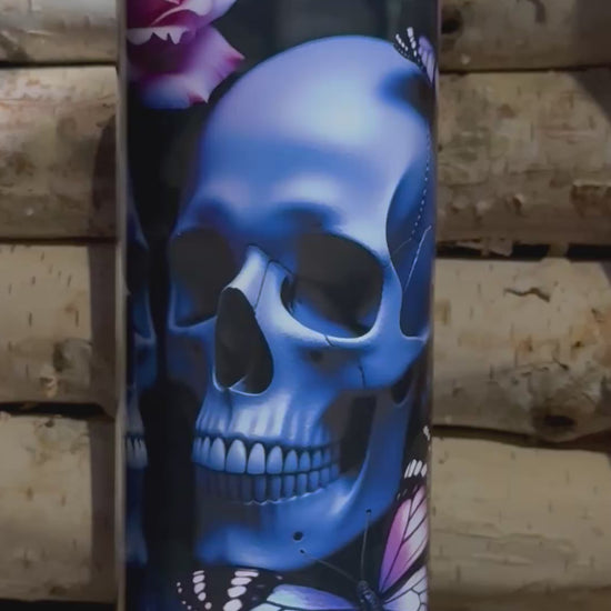 The Graveyard Monarch tumbler captures that quiet balance between decay and bloom, featuring ethereal blue skulls, blooming roses, and violet monarchs that glow softly once the lights fade.