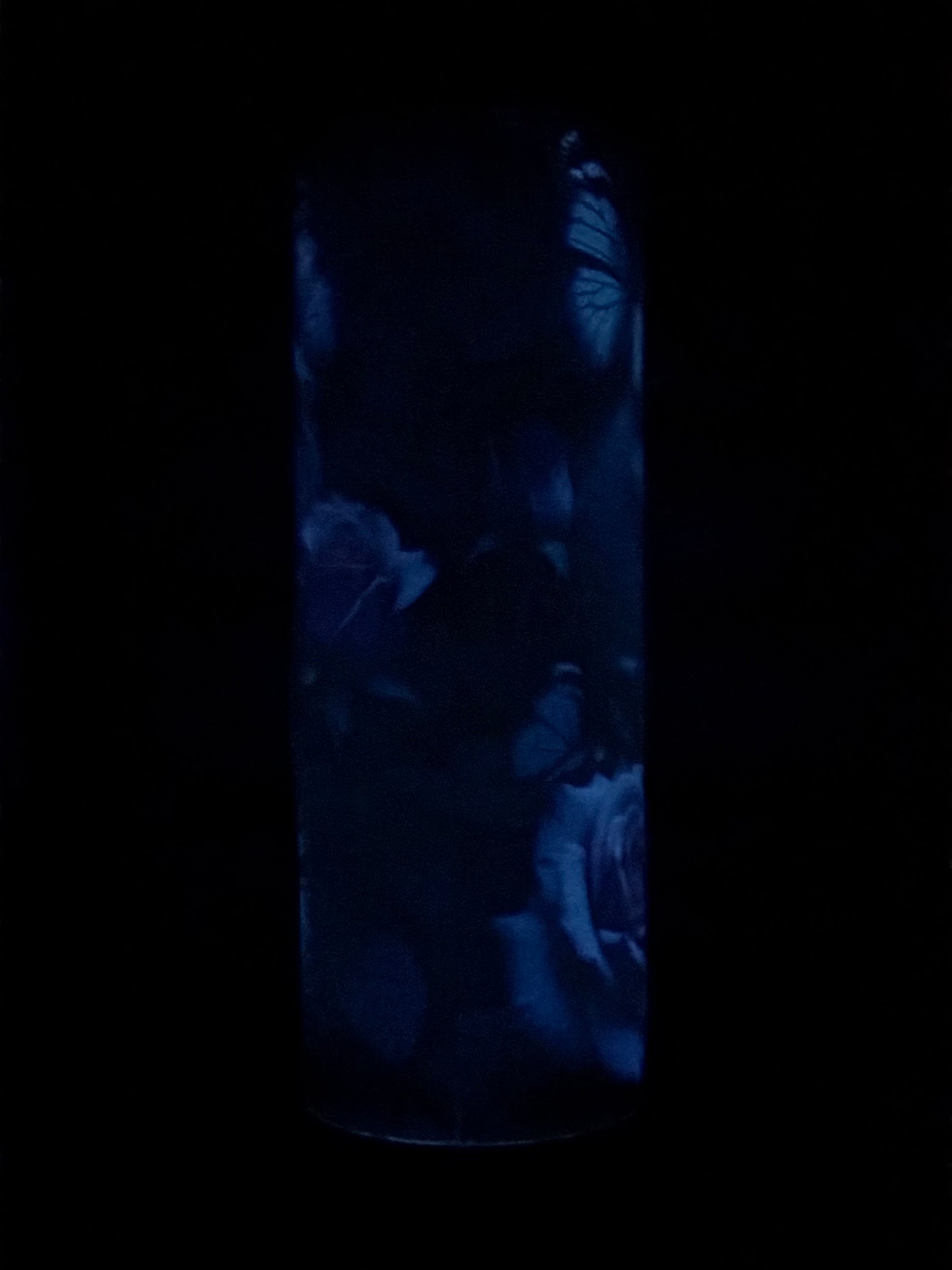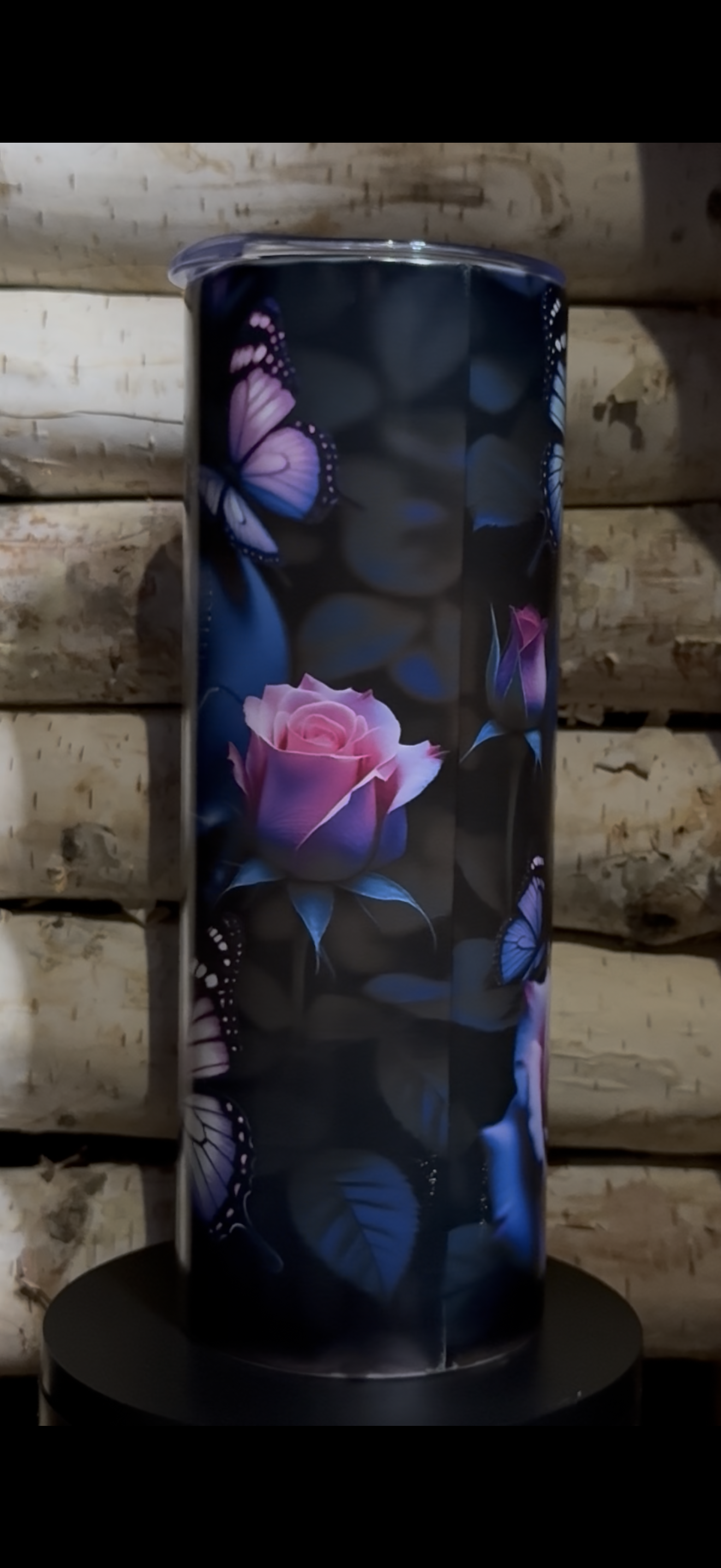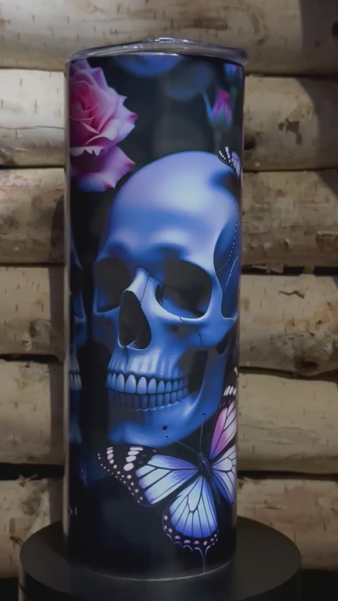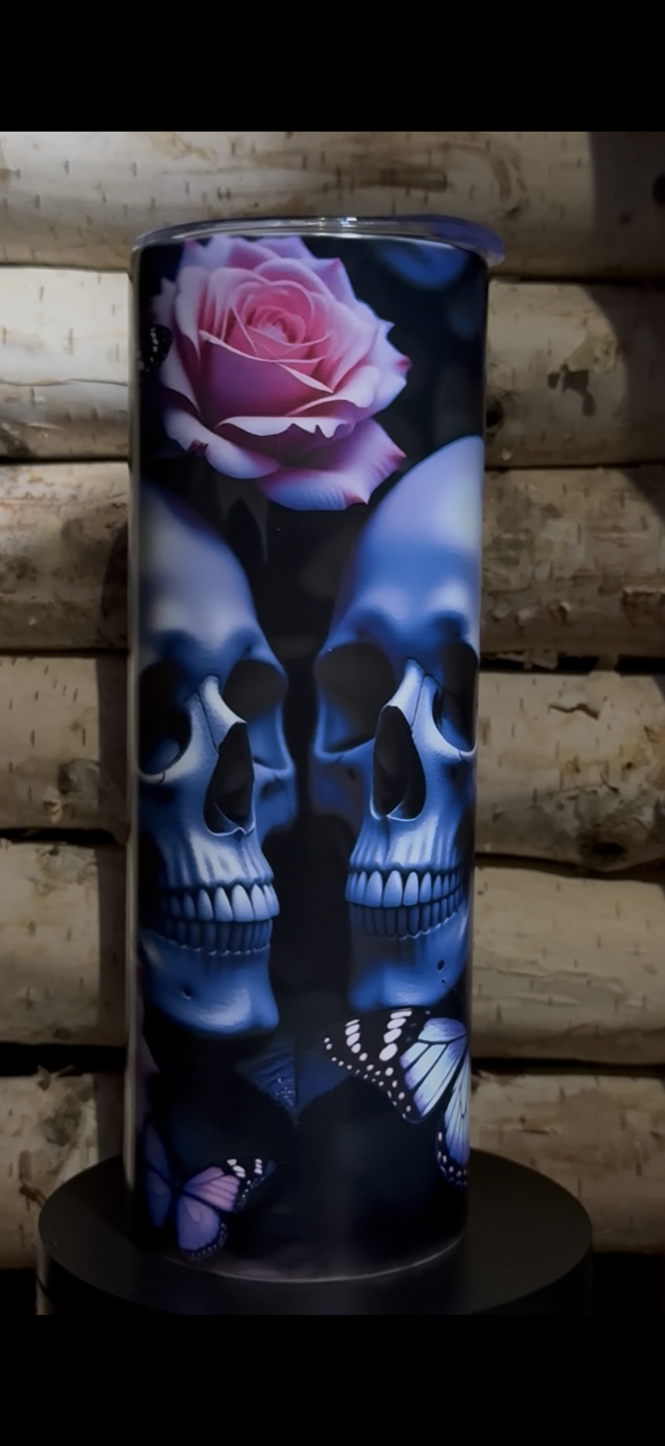 The Graveyard Monarch tumbler captures that quiet balance between decay and bloom, featuring ethereal blue skulls, blooming roses, and violet monarchs that glow softly once the lights fade.