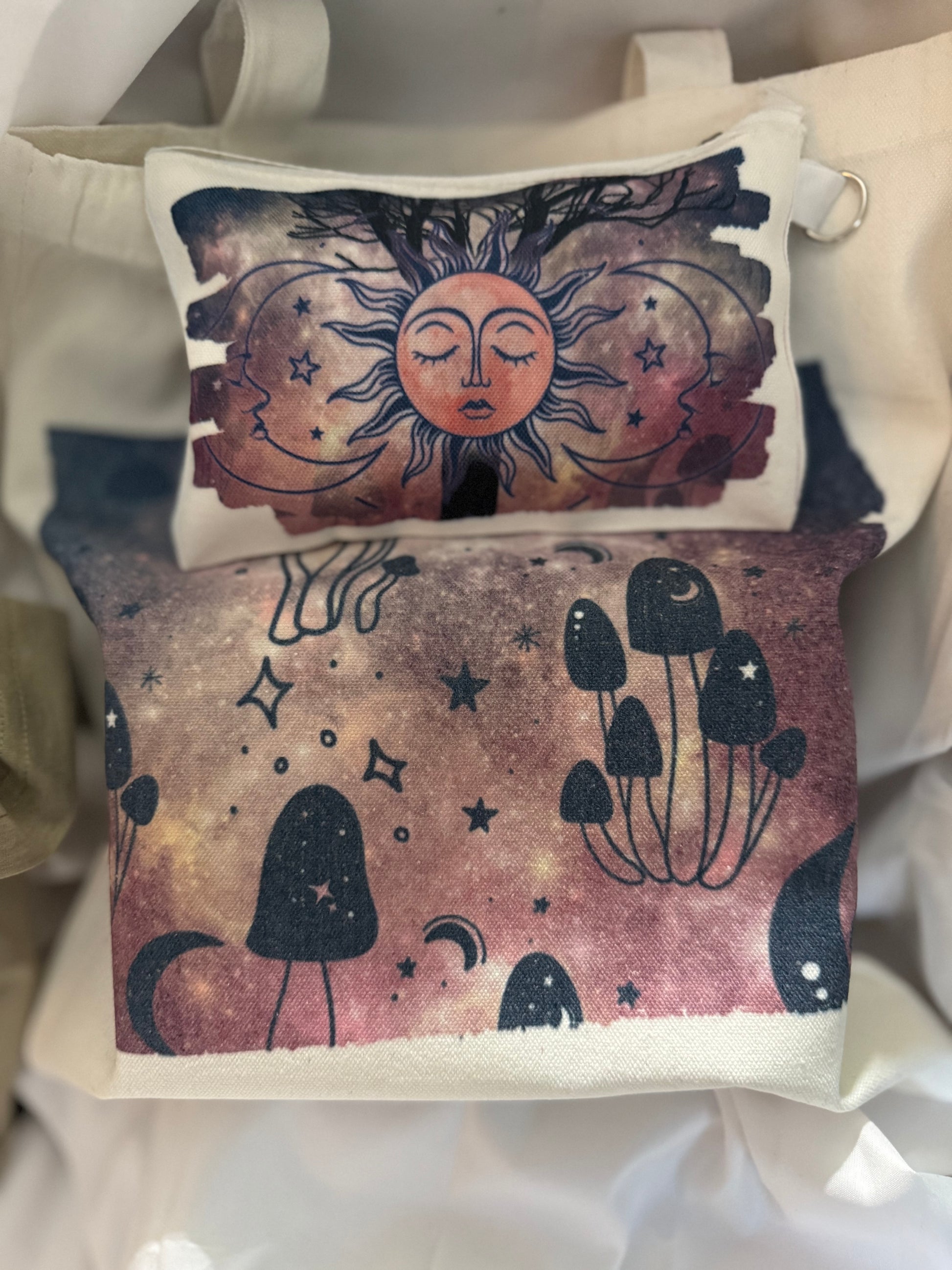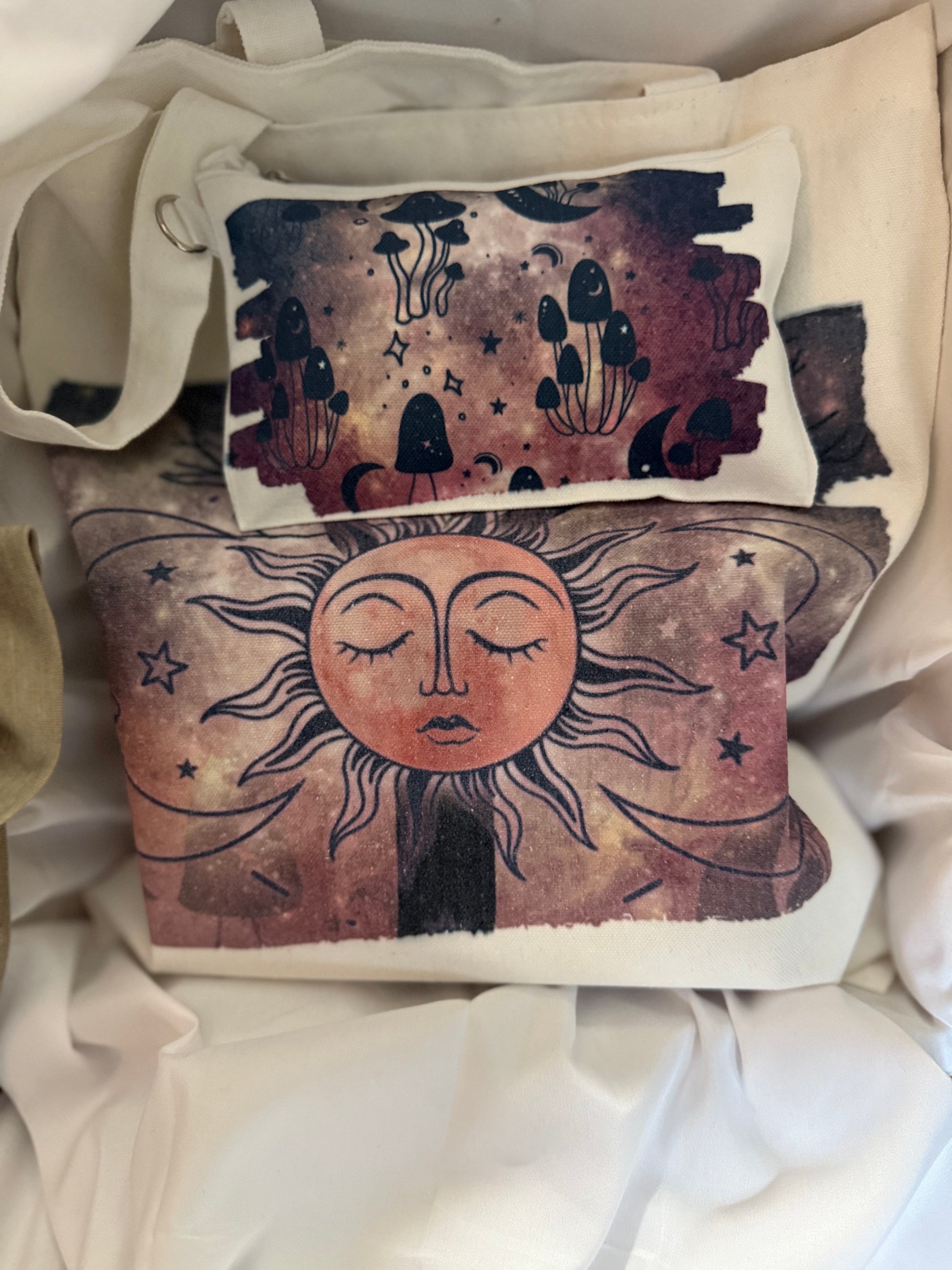 • A 12x14” canvas tote featuring designs on both sides, dreamlike and moody