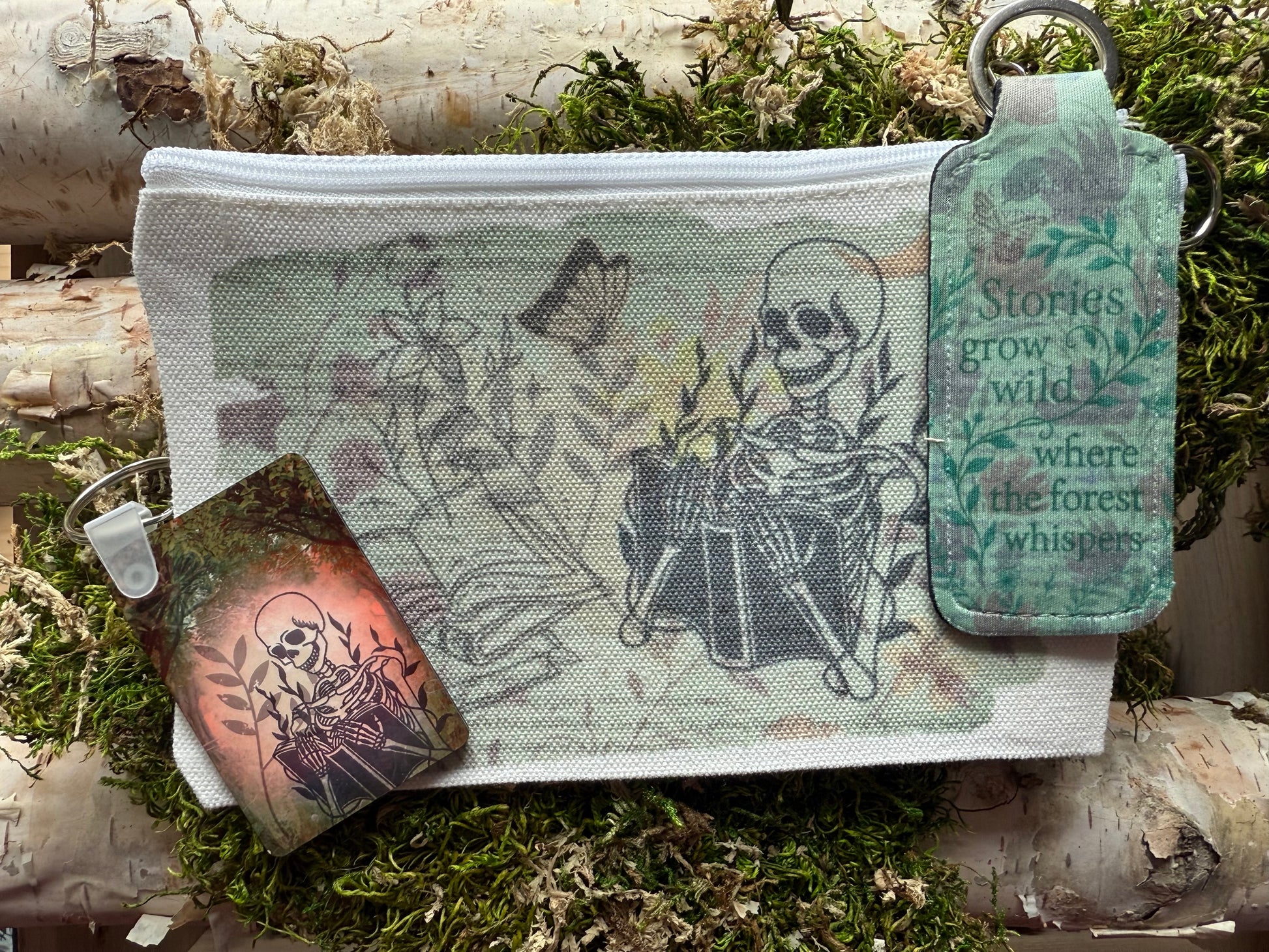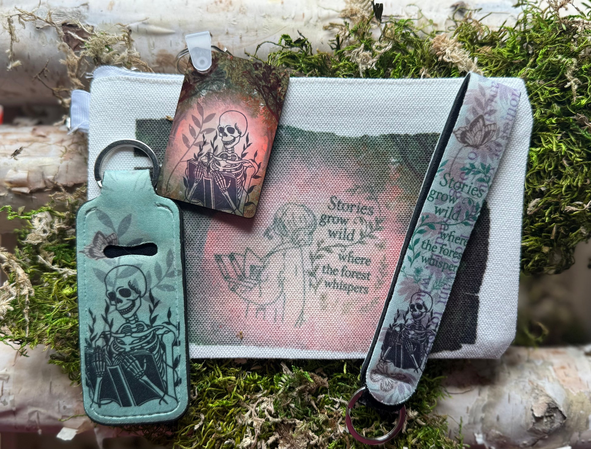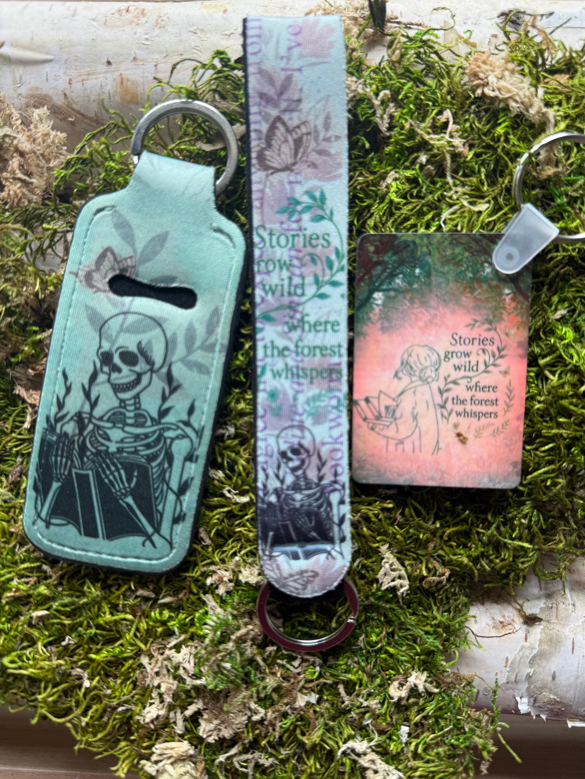Drifting into the Archive as the first of her kind, Whisperwild carries the hush of moss-covered trails and stories that cling to pine-scented dusk. This set echoes that same quiet pull—wrapped in soft forest greens, mist blues, and twilight grey. Look closely: subtle textures conceal fragments of worn pages and well-loved words, woven into the design like secrets only the forest remembers.